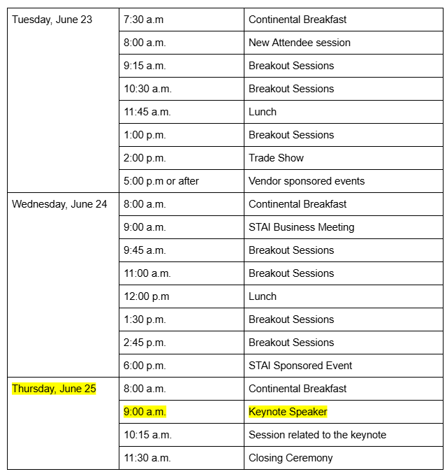 2027- French LickTuesday, June 29 through Thursday, July 1Hotel check in is Monday, June 28Hotel check out is Thursday, July 1 2028- Fort WayneTuesday, June 27 through Thursday, June 29Hotel check in is Monday, June 26Hotel check out is Thursday, June 29 2029- French LickTuesday, June 26 through Thursday, June 28Hotel check in is Monday, June 25Hotel check out is Thursday, June 28 2030- Fort WayneTuesday, June 25 through Thursday, June 27Hotel check in is Monday, June 24Hotel check out is Thursday, June 27